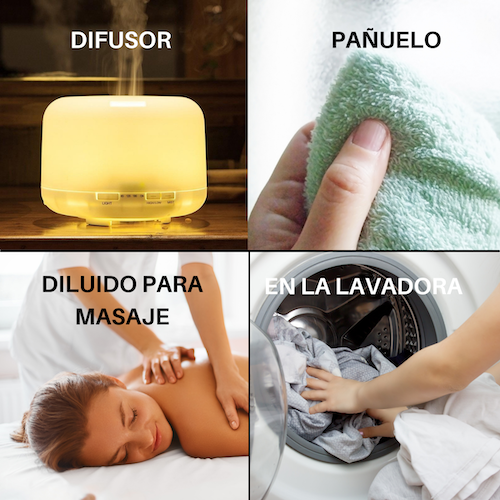 Agregar 1–3 gotas (es un aceite muy potente) en agua dentro del difusor.