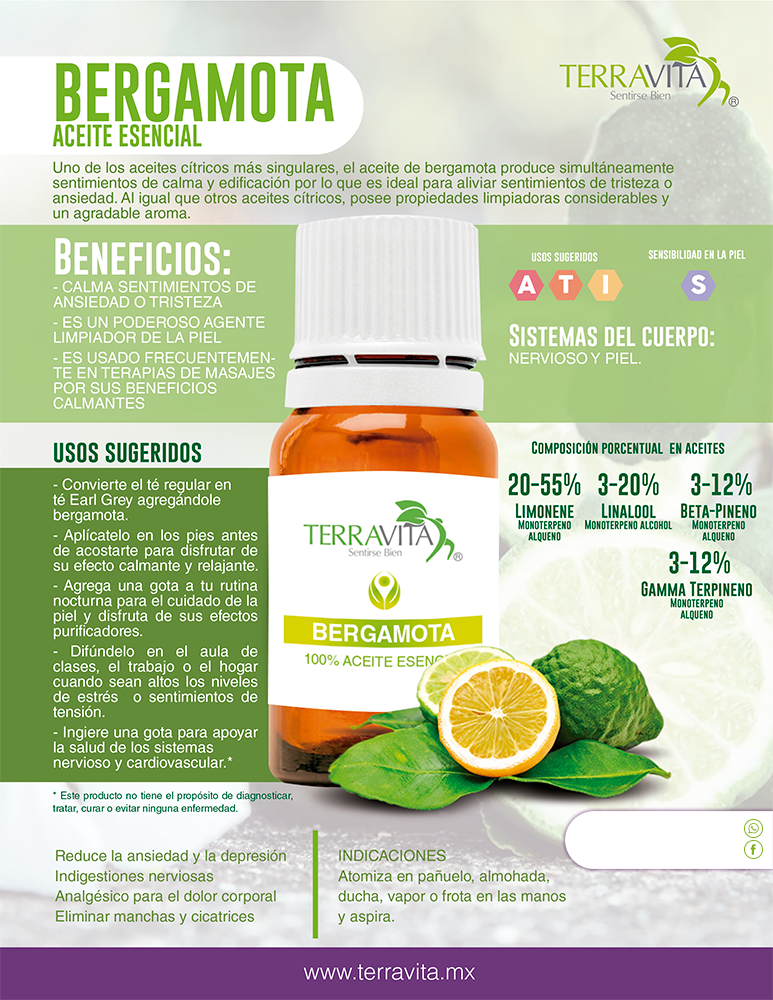 El aceite esencial de bergamota 100% puro se obtiene por presión en frío de la cáscara del fruto. Es reconocido por su aroma cítrico, fresco y ligeramente dulce, con un perfil terapéutico ampliamente valorado tanto en aromaterapia como en bienestar emocional y cuidado personal.